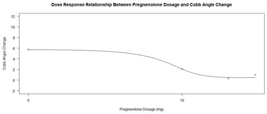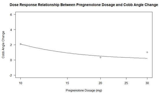 Another relationship tested in R-Studio was whether the dosage of pregnenolone alters the course of curve progression within the treatment group. Dose–response analyses of the treatment group’s dosages were performed along with another dose–response analysis with all the participants in R-Studio using the drm() function [15]. A summary plot of the dose–response analysis to the change in Cobb angle was also made for both analyses. Log-logistic analyses under three parameters were used to determine the p-values for the dose–response relationship for the treatment group, and four parameters were used for the entire group of participants.