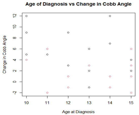 Age vs. change in cobb angle scatterplot (red dots indicate treatment group, black dots denote control group).