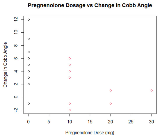 Pregnenolone dosage vs. change in cobb angle across all participants (red dots indicate treatment group and black dots indicate control group).
