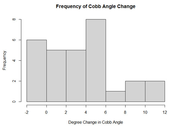 A further limitation to the study is the results from the normal distribution graph made in R-Studio. A histogram was used to plot the change in Cobb angle results as shown in Figure 17. The frequency was not normally distributed. Additionally, an asymptotic one-sample Kolmogorov–Smirnov test was used to analyze whether the change in Cobb angle was normally distributed. The p-value corresponding to the test was 0.00000000001253, indicating that the data are not normally distributed for the change in Cobb angle across all participants. From the linear analysis on the data, the following statistics are highlighted as follows. The formula for the linear regression (that corresponds with Excel’s values) is y = −0.6016x +11.25. The residual standard error is 3.891 on 21 degrees of freedom. The R-squared statistic is 0.0727 (which matches with the value calculated in Excel). The F-statistic is 1.003 on 6 and 21 degrees of freedom. Most notably, the p-value is 0.4496. Due to the extremely large p-value, there is very little evidence to support that the age of onset/diagnosis of scoliosis has an impact on the change in Cobb angle.