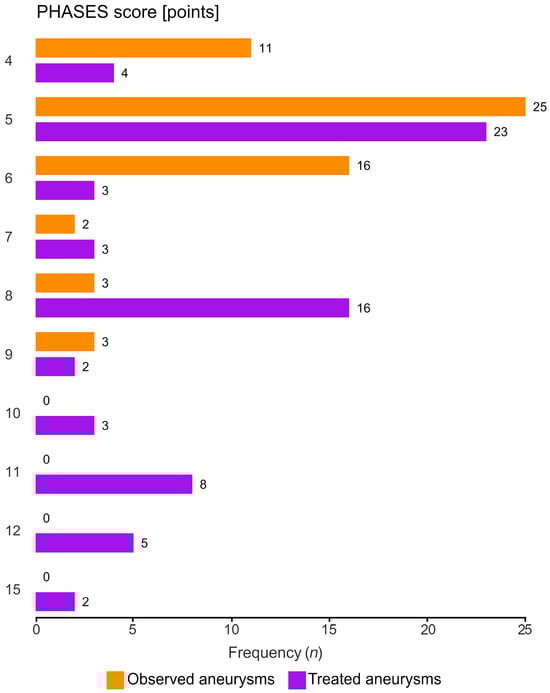 Figure 1. Distribution of PHASES scores across treated and observed unruptured anterior communicating artery aneurysms. Orange—observed aneurysms, violet—treated aneurysms.