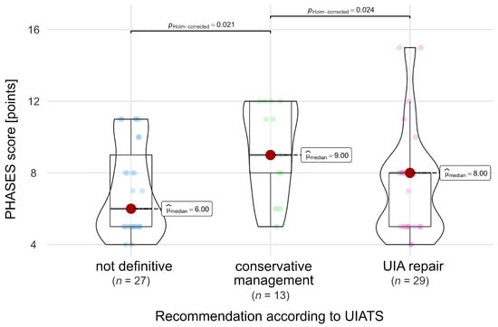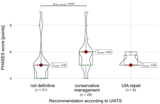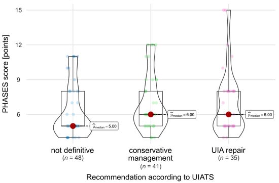 Figure 4. Comparison of PHASES scores in relation to UIATS recommendations in patients who underwent treatment. A dark red dot denotes the median value, while small dots indicate values of individual patients.