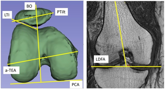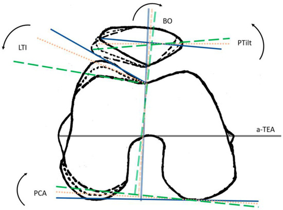 LDFA was determined in the coronary plane using the angle of the distal condylar line and the femoral shaft axis (so-called anatomic LDFA). PCA was measured in the axial image with reference to the anatomical transepicondylar line (a-TEA). The measurements of PTilt, LTI, and BO were referenced to the posterior condylar axis (Figure 1) [5,12]. All data collection associated with the imaging was carried out by one of the authors.