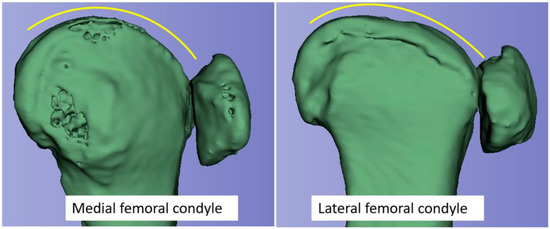 Typically, as seen in the skyline Laurin view, the patella aligns perfectly with the trochlea. A longitudinal examination of the femoropatellar joint, conducted by Krakow and Hungerford, confirmed that the patella contacts an almost flat surface with the corresponding lateral femoral condyle in the sagittal plane [19]. This means that, after flexion of about 30°, the lateral patellar facet slides out of the trochlea to a flattened plane of the lateral femoral condyle (transition area of trochlea to distal condyle) [20]. The different shape of the medial and lateral femoral condyle in the sagittal plane is shown in Figure 3.