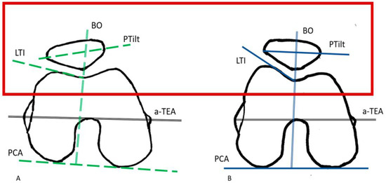(A,B): The key points of the illustration in Figure 2 are compared separately. (A) shows a sketch of a knee joint with significantly increased PCA and reduced LTI according to the trend results of the present study. Assumptions: In example (A), a TKA is inserted under posterior referencing. The contour of the anterior knee joint (delimited by the red frame) changes in the direction of (B). The LTI increases. Further results are flattening of the PTilt and medialization of the patella with reduction of the BO.