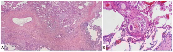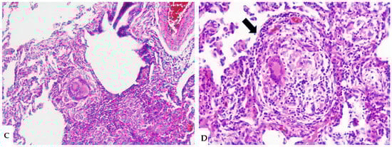 Figure 1A,B), along with the production of non-necrotizing granulomas in bronchiolar and peri-bronchiolar locations (