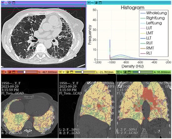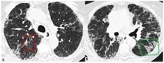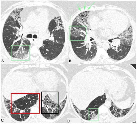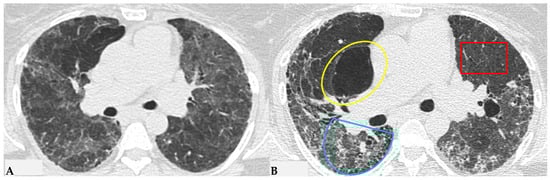 FHP: chest HRCT ((A,B): axial scan). Visible is the “three density pattern”, with areas of the lung with normal density spared from pathological changes (red box); areas of the lung with reduced density characterized by a paucity of vascular and bronchial structures (yellow box); areas of the lung with increased density showing reticulations, interstitial thickening and traction bronchiectasis (green box). Lung cyst (red arrow) and areas of smoking-related paraseptal emphysema and advanced destructive emphysema (ADE) (blue arrows) are also present.
