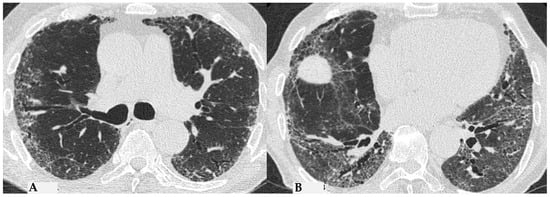 Figure 3), with a centrifugal distribution (broncho-centric) and extension along the bronchovascular axis. These semiotic characteristics significantly differ from the fine and delicate reticulation observed in IPF, reflecting the intrinsic characteristics of immune-mediated inflammatory damage [