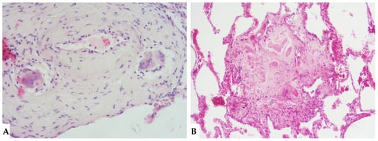 Figure 12A). Granulomas/giant cells are similar to those found in NFHP, but unlike the latter, they can be found anywhere in the parenchyma and not just in a peribronchiolar position. Moreover, they are highly useful when present; however, they are found only in a minority of FHP cases. In the differential diagnosis, granulomas and giant cells can occasionally be found in CTD-ILDs or even in other non-necrotizing chronic granulomatous diseases such as sarcoidosis but are not part of pathological alterations seen in UIP/IPF forms [