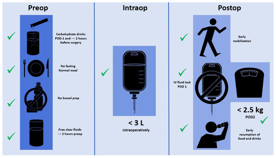 Besides IV fluid management, several further ERAS care items help to maintain tissue homeostasis and an euvolemic state [24]. Preoperative carbohydrate loading helps to attenuate the catabolic response through a reduction of insulin resistance in response to surgery [74]. Clear fluids can be safely ingested until 2 h before surgery, whereas 6 h fasting for solid food is sufficient [75]. While there is growing evidence in favor of combined mechanical and oral antibiotic bowel preparation, mechanical bowel preparation alone may lead to preoperative dehydration and electrolyte imbalances and should thus be avoided [76]. Postoperatively, early oral nutrition is advocated and has proven its benefits by several meta-analyses and has been endorsed by different nutritional societies [64]. Finally, early mobilization of at least 6 h per day is of utmost importance and helps to prevent muscle loss and to promote functional recovery due to a direct prokinetic effect on the intestines [77]. Figure 1 summarizes the pre, intra, and postoperative measures within the institutions’ standardized ERAS protocol.