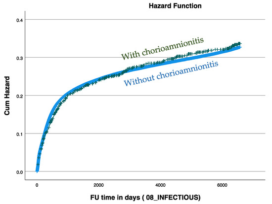 Statistical analysis was performed using the SPSS package 29th ed. (SPSS, Chicago, IL, USA). The general association between categorical data was assessed via chi-square. For comparison differences in continuous variables, the Student t-test was used. The Kaplan–Meier survival curve was used to compare cumulative hospitalization rates due to infectious morbidities according to maternal chorioamnionitis status during labor. The variance between the curves was assessed using the log-rank test. A Cox proportional hazards model was used to investigate the association between chorioamnionitis and offspring infectious morbidity. The model was adjusted for possible confounders including maternal age at delivery, gestational age (across term), mode of delivery, maternal diabetes mellitus, and hypertensive disorders. All analyses were two-sided, and a p-value of ≤0.05 was considered statistically significant.