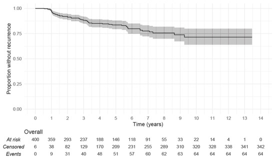 Kaplan–Meier plot showing the proportion of all ears surviving without recurrence of cholesteatoma over time. 95% confidence intervals in grey shadow.