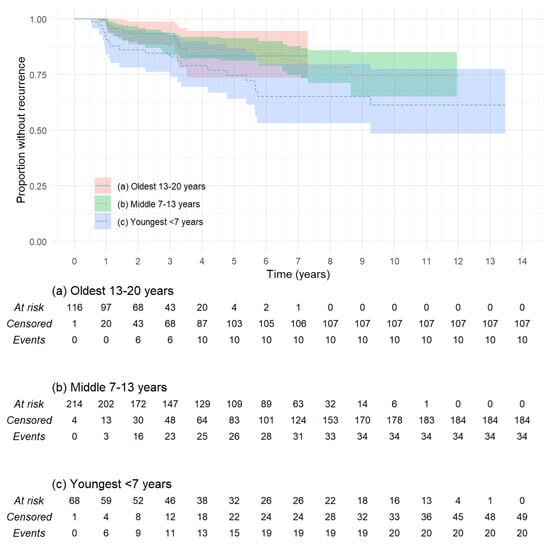 Kaplan–Meier plot comparing rate of recurrence in different age groups, grouped as oldest (age 13–20 years), middle (7 to <13 years), and youngest (under 7 years). The youngest children have greater risk than older children (log-rank p = 0.075).