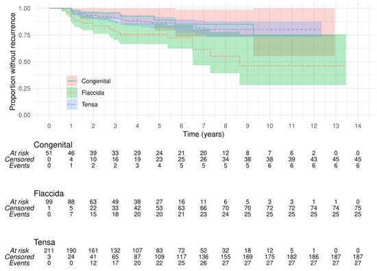 Kaplan–Meier plot showing the time course of development of recurrent cholesteatoma after removal of congenital, pars flaccida, or pars tensa cholesteatoma. The risk was significantly greater for recurrence of pars flaccida cholesteatoma with this univariate analysis (log-rank, p = 0.001) compared with tensa or congenital which were not significantly different.