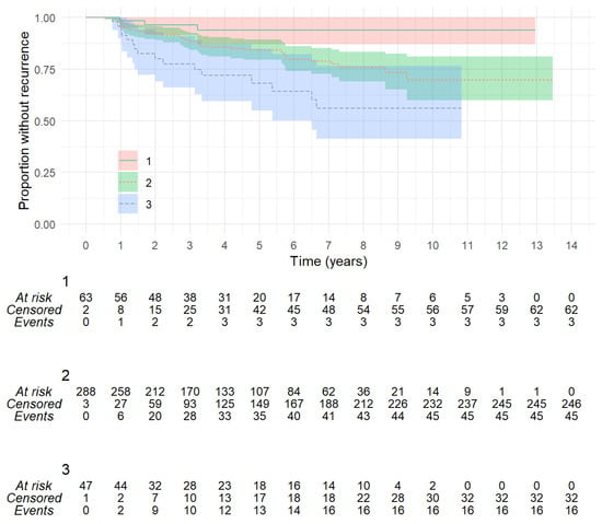 Kaplan–Meier plot of recurrent cholesteatoma according to EAONO-JOS stage. A clear increase in risk with increasing stage is visible. Stage 1, disease limited to the subsite of origin, has least risk. Stage 2 includes cholesteatoma in two or more subsites without other markers of severity. Stage 3 includes cholesteatoma causing more erosive disease and has the highest risk (log-rank, p = 0.0011).