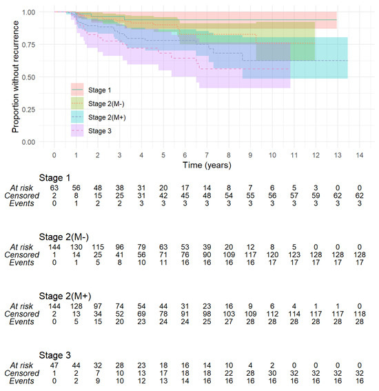 In this Kaplan–Meier plot, EAONO-JOS Stage 2 has been subdivided according to absence (M−) or presence (M+) of cholesteatoma in the mastoid. Increasing risk of recurrence is visible for larger and more erosive cholesteatoma (log-rank, p = 0.00027).