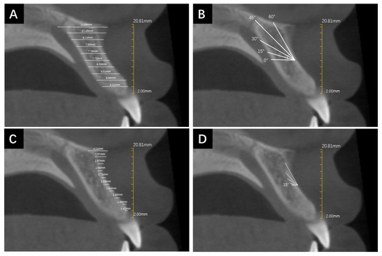 The measurement method of bone depth and cortical bone thickness in different rotation angles. (A) The measurement lines originated from the labial edge of the alveolar bone at various height levels and extended to the palatal edge of the alveolar bone to represent alveolar BD. (B) CBCT image rotated counterclockwise 15°, 30°, 45°, and 60° to simulate BD measurements under different insertion angles. (C) The measurement lines originated from the labial edge of the alveolar bone at various height levels and extended to the edge of labial cortical bone to represent CBT. (D) CBCT image rotated counterclockwise 15°, 30°, 45°, and 60° to simulate CBT measurements under different insertion angles.
