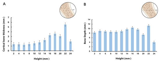 (A) The variation trend in cortical bone thickness at different height levels. (B) The variation trend in bone depth at different height levels.