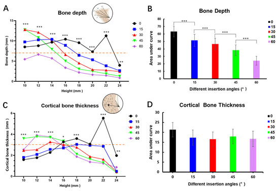 (A) Mixed effects analysis of bone depth in different height levels and insertion angles. (B) The area under the curves of graph (A). (C) Mixed effects analysis of cortical bone thickness at different height levels and insertion angles. (D) The area under the curves of graph (C). *: p < 0.05; **: p < 0.01; ***: p < 0.001.