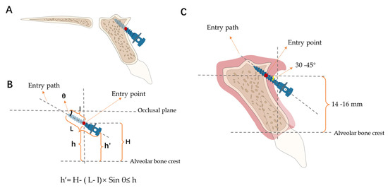 In the past, the inter-radicular space between the central incisors was the most common site for mini-implant placement, enabling simultaneous proclined and intrusive effects on maxillary anterior teeth. Nevertheless, a considerable proportion of malocclusion patients exhibit anterior teeth crowding [4,5,6], resulting in a restricted inter-radicular space between the central incisors that is insufficient to accommodate a 1.5–2 mm diameter mini-implant. Additionally, the use of a thinner diameter mini-implant for anchorage may not provide adequate stability [7]. The tooth root–mini-implant contact may give rise to detrimental consequences, such as root damage, and thus ultimately results in the loosening and dislodgement of the mini-implant. One potential approach involves augmenting the angulation and insertion height level of the mini-implant to attain safer distance between roots.
