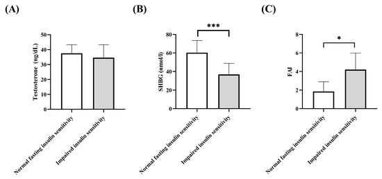 Androgenic parameters. (A) Testosterone levels. Testosterone levels did not differ among the groups. (B) SHBG levels. The impaired insulin sensitivity group had significantly lower SHBG level than the normal insulin sensitivity group. (C) Free androgen index. The FAI was significantly higher in the impaired insulin sensitivity group than in the normal fasting insulin sensitivity group. Data presented as median with 95% confident interval confidence interval. Mann–Whitney test, * p < 0.05; *** p < 0.001.