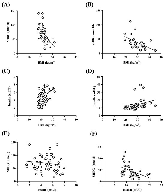 Linear regression analysis showed that BMI was negatively associated with SHBG levels in both groups (Figure 2A,B), while BMI was positively associated with insulin concentrations in both groups (Figure 2C,D). However, SHBG levels were negatively associated with insulin concentrations in impaired insulin sensitivity groups, but this inverse association could not be observed in the normal fasting insulin sensitivity group (Figure 2E,F).