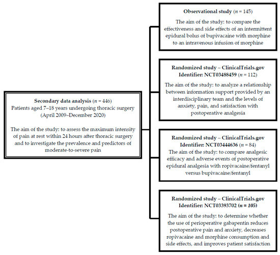 This was a secondary data analysis of one observational trial [23] and three randomized controlled trials (Clinicaltrails.gov ID: NCT03488459, NCT03444636, and NCT03393702), with the primary aim of assessing the effect of postoperative pain management interventions. The above-mentioned trials included 446 pediatric patients, and were conducted between April 2009–December 2020 in the Department of Thoracic Surgery at the Institute of Tuberculosis and Lung Disease, Rabka Zdrój Branch, Poland (Figure 1).