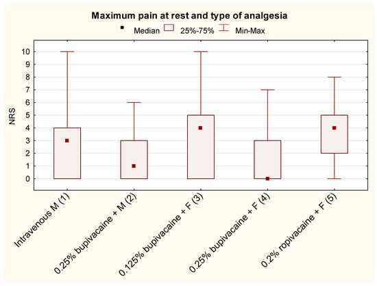 Maximum pain intensity at rest and the type of postoperative analgesia in pediatric patients within 24 h of thoracic surgery (M = morphine; F = fentanyl; Statistically significant intergroup differences—post hoc test results: 1 vs. 2, p = 0.0086; 1 vs. 4, p = 0.0001; 2 vs. 3, p = 0.0253; 2 vs. 5, p = 0.0002; 3 vs. 4, p = 0.0011; and 3 vs. 5, p = 0.000004).