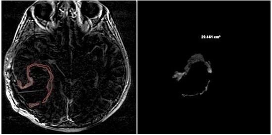 Contrast enhancement postoperative tumor volume (CE-RTV) manual evaluation, achieved with subtraction imaging technique to minimize errors due to the spontaneous hyperintensity of degradation products of hemoglobin.