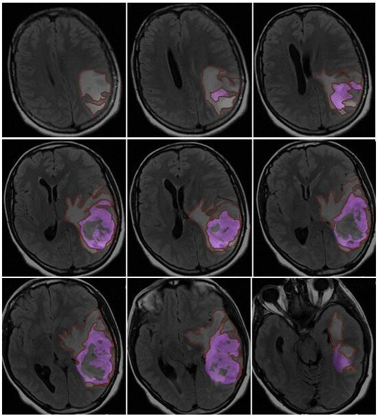 T2-weighted images are sensitive to variations in water content and are useful for highlighting vasogenic-type edema, which usually contains infiltration by neoplastic cells and typically appears hyperintense (bright) in GB. FLAIR sequences suppress cerebrospinal fluid (CSF) signals, enhancing the visibility of abnormalities near CSF-filled spaces and making it easier to identify tumor borders.