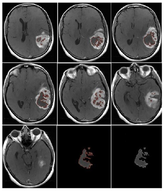 Contrast enhancement postoperative tumor volume (CE-RTV) semiautomatic evaluation, assessed on 2D axial CE-T1w images (slice thickness: 5 mm; slice spacing: 5.5–6 mm), achieved with the semiautomatic subtraction imaging technique.