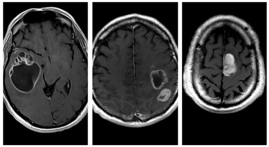 Furthermore, we investigated the following relevant qualitative characteristics of GB: tumor localization (the lobe containing the enhancing mass or, in case of radiological multifocality, the lobe corresponding to the main tumor mass was considered as the tumor site); eloquent area involvement (defined as neoplastic infiltration of the cortex or iuxta-cortical white matter of eloquent areas, such as motor, visual, Wernicke’s area, or Broca’s area); and radiological appearance (distinguished by three different patterns based on the enhancing wall thickness on CE-T1w sequences: thin, with enhancing wall thickness < 3 mm; thin-nodular, with enhancing wall showing focal thickening > 3 mm; and nodular, with solid appearance predominant and intratumoral necrosis absent or less than 1.5 cm3) (Figure 8). Similarly, we identified two morphological categories: “pseudocapsulated” and non-pseudo-capsulated masses, depending on the macroscopic appearance of a pseudocleavage plane at the time of neurosurgery. Furthermore, we analyzed the presence of ependymal involvement (defined as visible signal alteration on FLAIR images or tumor mass joining the ependymal interface) and focal or multifocal disease (focal if only a single mass was observed; multifocal if multiple tumor foci were visible, contiguous to FLAIR signal alterations or not, with no difference between the terms “multifocal” and “multicenter”).