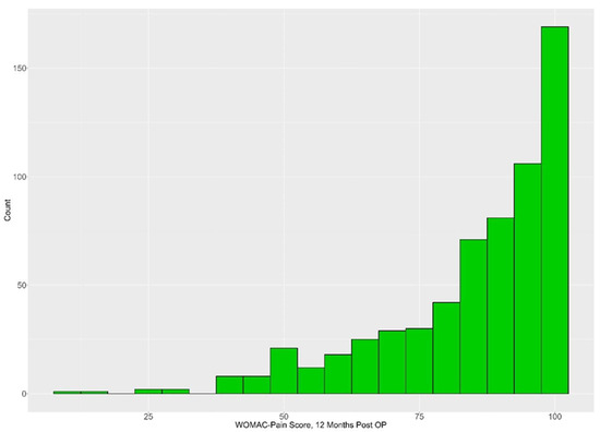 Considering all available data, with the number of participants decreasing over time, the results for the different measurement time points are shown in Table 3. The mean WOMAC score increased from 50.84 at baseline to 84.93 one year after surgery. For the 620 patients for whom the WOMAC pain score was available at baseline and at 1-year follow-up, the pain scores improved by an average of 32.92 (SD 21.57; median 35.00; Q1, Q3: 20.00, 50.00; range −40–95) points. The vast majority of patients (74.9%) achieved 80 or more points in the WOMAC pain score one year after the surgery (Figure 2).