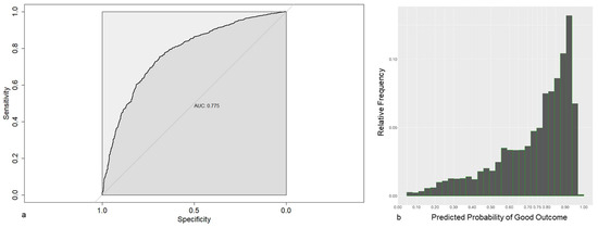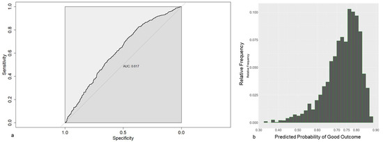 (a) Receiver operating characteristics for prediction models based on preoperative data, using LASSO-1se. (b) Frequencies of the estimated probabilities for the prediction model based on preoperative data.