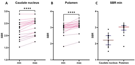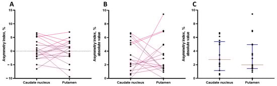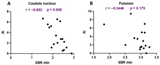 - Asymmetry index (AI):AI = (SBRin left ROI − SBRin right ROI)/(SBRin left ROI + SBRin right ROI) × 100%.