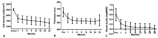 Outcomes of (A) endothelial cell density, (B) central corneal thickness, and (C) visual acuity measurements over a 36-month time period.