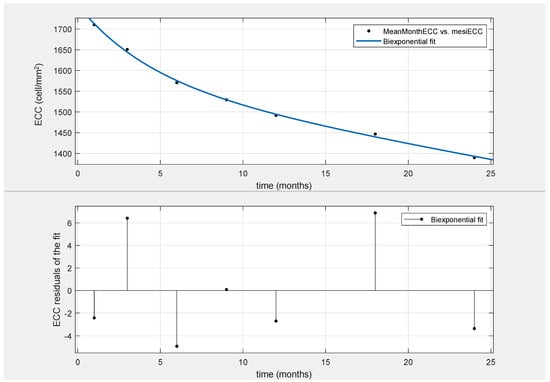 Mathematical modeling was performed using Microsoft Excel (version 16.44) and the MATLAB (Version R2023b, Mathworks, Natick, MA, USA) system. Based on previous publications, two components of postsurgical ECL can be defined as an early rapid phase (until the 6th month postoperative) and a late slow phase (beyond 6 months postoperative). In order to describe endothelial cell decay over time in a mathematical function, we analyzed all different monoexponential and biexponential functions in relationship to the average values of ECC over 24 months obtained from our patients. The parameters of this model were calculated in MATLAB using a nonlinear least squares algorithm. Goodness of fitting was expressed by an R-square value (range between 0 and 1, with a value closer to 1 indicating a greater proportion of variance accounted for by the model). Once the best fitting curve and corresponding equation had been identified, the curve was extended over time to obtain our prediction model. The equation of the model was specified as follows: Fit (x) = a × exp (b × x) + c × exp (d × x), where x represents the time (in months). For each exponential term, a (or c) represents a scaling factor of the exponential function, whereas b (or d) is the power of the decrease (negative value) or of the increase (positive value); a (c) scales the value of the fit to the range of the values that were observed, b (d) provides the “speed” of the decrease in the two phases (early/late) in time. Half times for the early phase and late phase of the decay were calculated as ln 2/exponential rate constant (that is, “b” for the early phase and “d” for the late phase) [5,6].