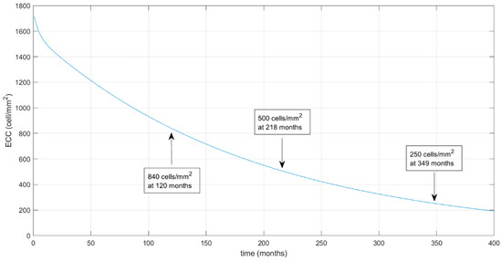 The extrapolated prediction model with an extension of the curve over time until the ECC reaches the predicted values of 500 and 250 cell/mm2 (which occurred at 218 and 349 months, respectively) is shown in Figure 3.