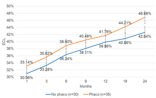 The effect of cataract extraction combined with DMEK on ECL was further analyzed. Thirty-five eyes (53.85%) underwent DMEK combined with cataract extraction and IOL implantation. Thirty eyes (46.15%) underwent DMEK surgery alone. In both cases, the h value equaled 0. The ECL in DMEKs with or without cataract surgery in our cohort of patients did not show any statistical difference between the groups at any time point over 24 months (Figure 4).