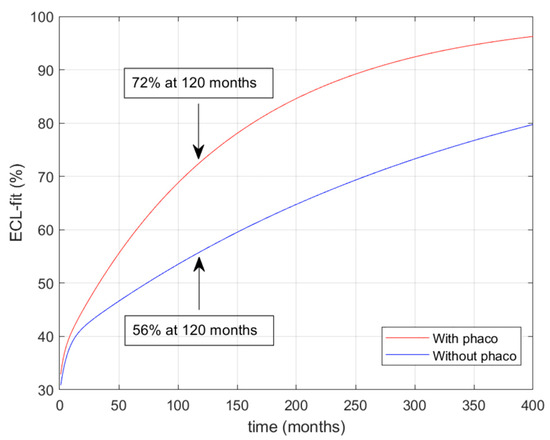 The ECL prediction over time in both groups is represented in Figure 5. It reaches 72% at 120 months postoperatively in the group that underwent cataract surgery (red line in figure). In the group with only the DMEK procedure, the ECL prediction is 56% at 120 months from surgery (blue line in figure).