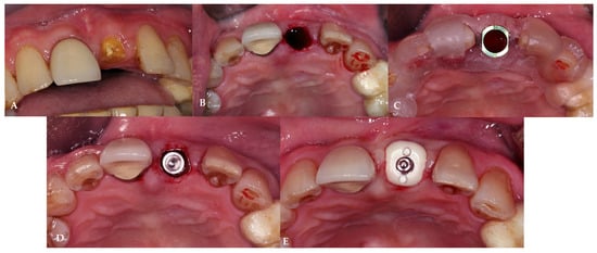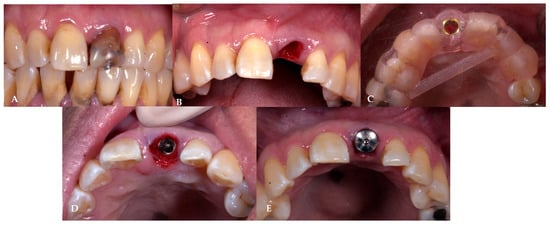 - Janakievski, J. Case report: Maintenance of gingival form following immediate implant placement—The custom-healing abutment. Adv. Esthet. Interdiscip. Dent. 2007, 3, 24–28. [Google Scholar]