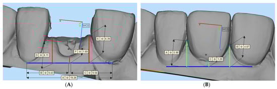Papillae height and midfacial height at the baseline and at the 6-month follow-up were analyzed using computer software (Materialise Magics 23.01, Materialise, Leuven, Belgium). After precisely overlapping the T0 and T6 STL files in a common coordinate system, a standardized line (blue) was created connecting the two most apical points of the marginalgingiva of adjacent teeth, serving as a horizontal reference for the vertical measurements. Three measurements were computed in each STL file to calculate the mesial and distal papilla height and midfacial papilla height at T0 and T6. The mPHv, dPHv, MFHv, and PHv were obtained using the following formulas: