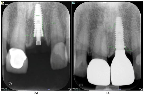 Vertical bone loss via periapical radiograph was adapted from Perez, A. et al. [21] and is presented in Figure 7. The peri-implant marginal bone level was measured at baseline (T0) and then at the 6th month (T6) on intraoral radiographs at the mesial and distal aspects (m and d). It was defined as the distance between the reference point and the most apical point of contact between the implant surface and the bone, with the reference point being the fixture–abutment interface. The sign of the marginal bone level was considered negative when apical to the fixture–abutment interface. Digital intraoral periapical radiographs were taken (70 KVp, 7 mA) using a parallel cone technique with a digital sensor. A paralleling device and individualized bite blocks made of polyvinyl siloxane impression material (Impregum, Espe Dental AG, Seefel, Germany) were employed to standardize the X-ray geometry. Calibration was performed using the known thread pitch distance of the implants (0.8 mm). In cases where threads were not clearly visible on the radiographs, previously known values such as fixture diameter and length were used for calibration. Measurements were conducted using a Picture Archiving and Communication System (PACS). The marginal bone change (BC) was determined to the nearest millimeter using the following formula: