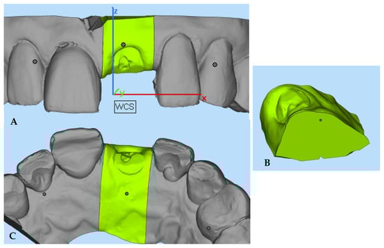 The digital analysis protocol was adapted from the method described by Fernandes, D. et al. [24] and is presented in Figure 5. After the superimposition study models, a color map was created to quantitatively analyze dimensional variations occurring in the surgical areas and surrounding tissues. Green represents areas where no 3-dimensional changes were found, while variations between yellow and red represent volume increase, and variations between light blue and dark blue represent a volume decrease.