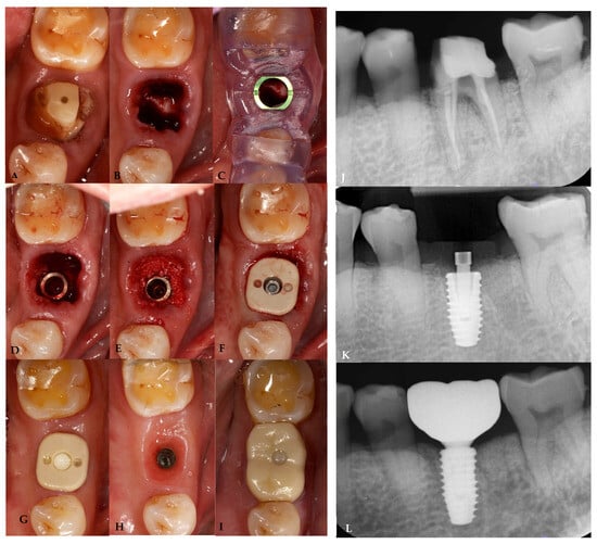 Clinical procedure. Fractured left lower first molar (A), after extraction (B), surgical guide try-in and protocol drill (C), immediate implant placement with simultaneous filling of the gap around implant with grafting material (D,E), customized healing abutment insertion (F), 4 months of healing (G,H), final prosthesis insertion 6 months after implant placement (I). Periapical radiograph of the pre-extraction tooth (J), healing abutment insertion (K), and final prosthesis insertion (L).