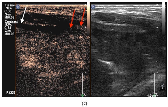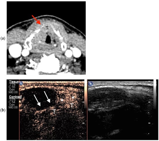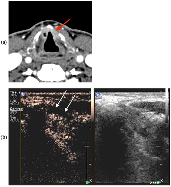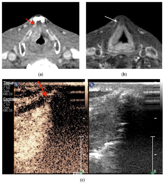 Contrast-enhanced ultrasound (CEUS) can be used to assess and quantify microcirculation in normal and pathological conditions with a good acoustic window []. Moreover, it has been widely used in clinical practice to diagnose hepatic and renal pathologies [,]. In a recent publication, CEUS showed potential in assessing non-ossified thyroid cartilage invasion []. Non-ossified thyroid cartilage and adjacent laryngeal cancer are well visualized on CEUS due to the differences between non-enhancing non-ossified thyroid cartilage and enhancing adjacent laryngeal cancer. Therefore, the detection of enhancement along the course of a thyroid lamina contacting a tumor suggests infiltration. However, there is currently a lack of studies and data that can strongly support the use of CEUS as an additional imaging modality in the diagnostic algorithms for determining the local spread of laryngeal cancer more accurately.