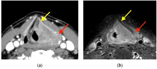 However, most studies evaluating the diagnostic performance of imaging techniques in the detection of cartilage invasion tend to focus—intentionally or unintentionally—on the ossified cartilage. This occurs for several reasons: first, because, in most cases, invasion involves the ossified parts, and second, because CT and MRI better visualize the invasion of ossified cartilage, manifesting with a panel of findings including sclerosis, erosion, or destruction with cartilage replacement by tumor tissue []. This is mainly due to the lack of differences in density in CT images between the tumor and the non-ossified thyroid cartilage and because of the overlapping features of the tumor and non-neoplastic changes such as reactive inflammation, edema, and fibrosis in MRI images [,]. Peritumoral inflammation is another potential confounding factor at the interface between a tumor and cartilage, although the combination of different sequences may improve differentiation when conducting MRI.
