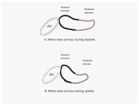 Characteristically, the annulus adopts a saddle-shaped form with distinctive anterior and posterior horns. During the systolic phase of the LV, the annulus moves downward. However, as the downward motion of the posterior horn is greater than that of the anterior horn, the annulus folds along the inter-commissural diameter, bringing the anterior annulus closer to the posterior annulus during LV systole [16] (Figure 1). The differential motion accentuates the saddle shape during LV systole (deepening of the saddle height), thereby promoting valve coaptation and deterring MV regurgitation. Additionally, the differential downward motion minimizes stress on the MV leaflets by reducing the mitral valve area by 20–42%, allowing a more resilient MV to withstand elevated LV systolic pressures [15,16,17].