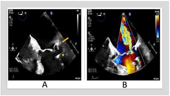 TEE images of 67-year-old woman with severe MR. (A) shows posterior annulus calcification (arrow) with sub-valvular apparatus extension (star. (B) shows posteriorly directed MR jet due to posterior leaflet restriction. (TEE: transesophageal echocardiography, MR: mitral regurgitation).