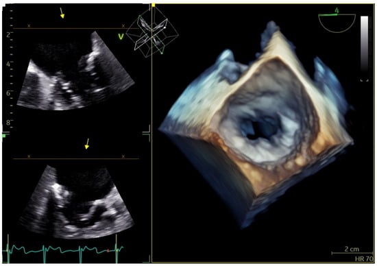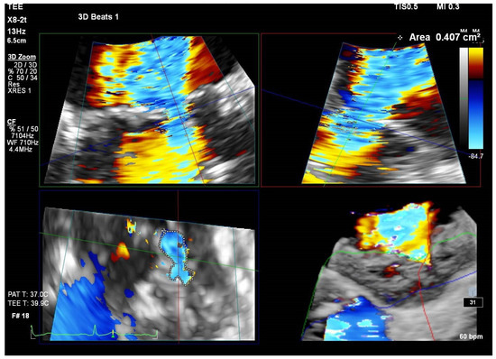 Three-dimensional echocardiography is a promising tool for the evaluation of MAC-related MR. Specifically, 3D vena contracta area obtained via TEE with 3D color Doppler provides a more accurate appraisal of MAC-related MR severity. A study by Goebel et al. [44] indicates that 3D vena contracta area (see Figure 7) correlates more closely with Rvol than the PISA method. The latter tends to overestimate EROA, leading to a potential misclassification of moderate MR as severe (see Table 2).